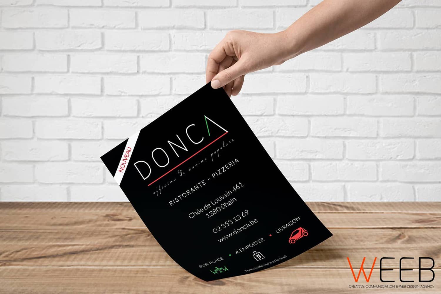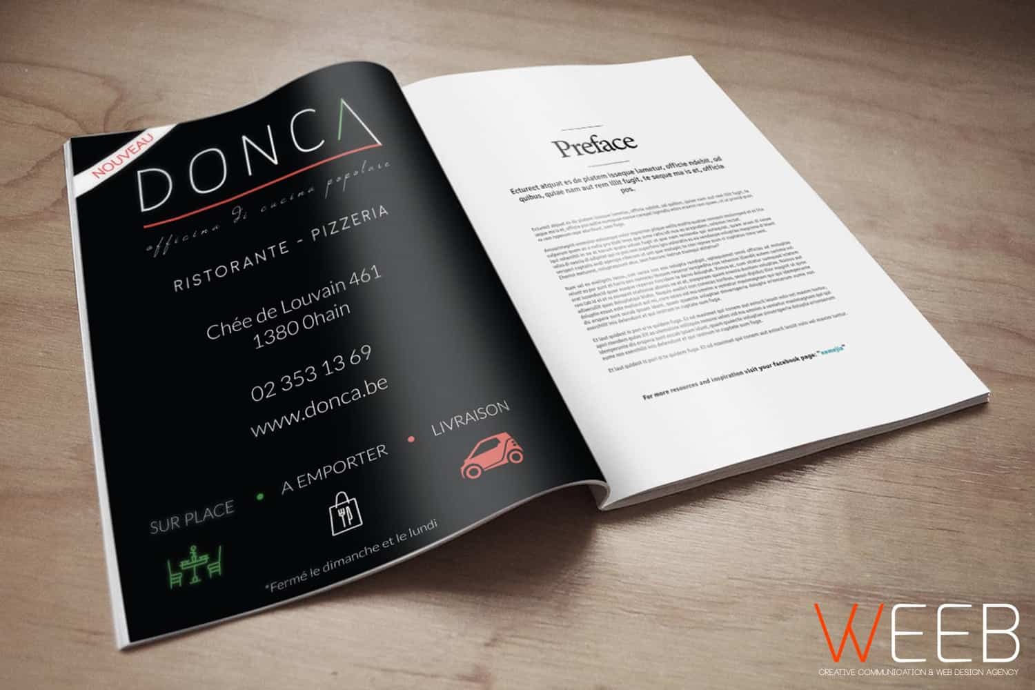 Le Donca est un restaurant italien situé à Ohain (Lasne) qui propose des plats à consommer sur place, à emporter ou en livraison. Du logo au site site internet, en passant par leurs cartes de visite, leurs enseignes et le lettrage de leurs véhicules, nous avons veillé à conserver une certaine cohérence dans leur communication. Nous gérons également leurs réseaux sociaux pour une visibilité optimale sur la toile.